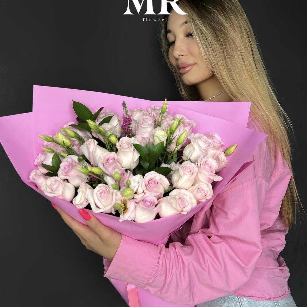 Композиция с кустовыми розами, эустомой и декоративной зеленью "Нежная фантазия"