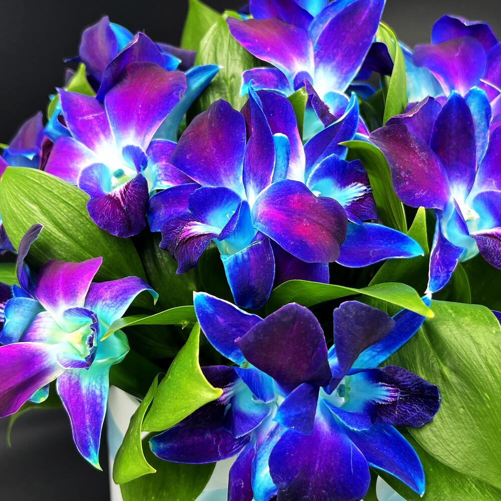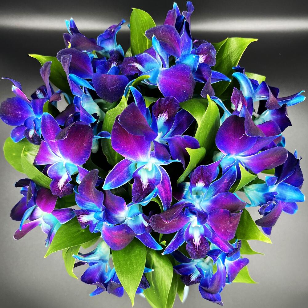 орхидея дендробиум синяя бутоны – 29 шт.удлинитель для орхидеи – 15 шт.Рускус – 10 шт.любовь флориста (бесплатно) – 1 шт.Шляпная коробка – 1 шт.Лента атласная – 1 шт.инструкция по уходу за цветами – 1 шт.Средство для продления жизни цветов – 1 шт.
