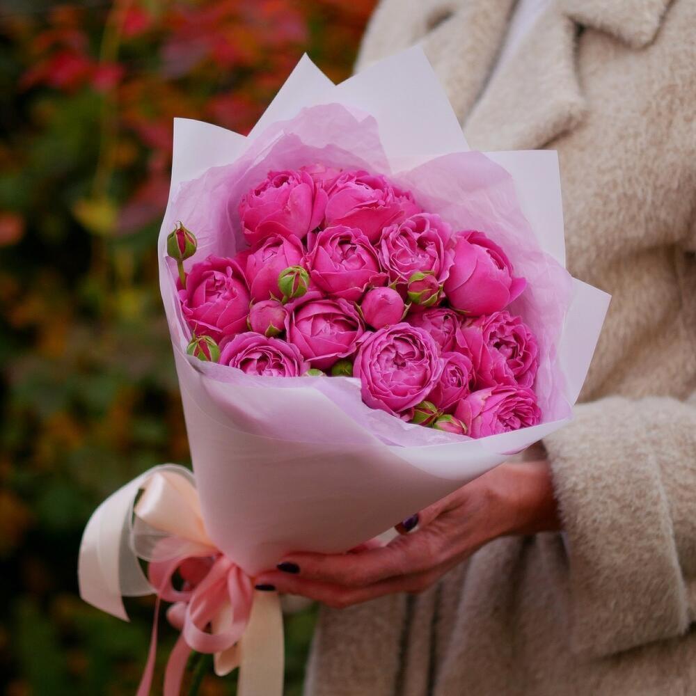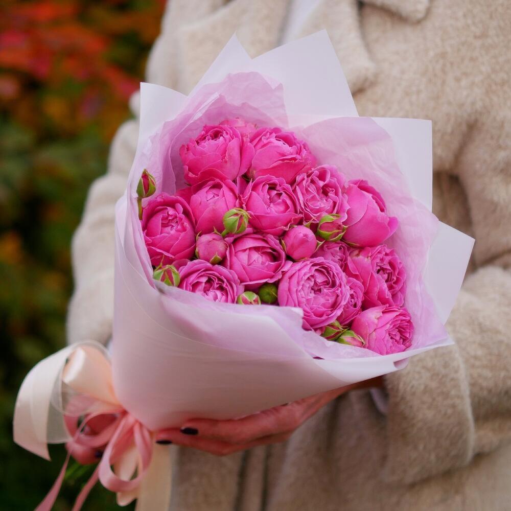 Misty Bubbles пионовидная роза – 7 шт. Упаковка дизайнерская – 1 шт. Открыточка с вашими пожеланиями – 1 шт.