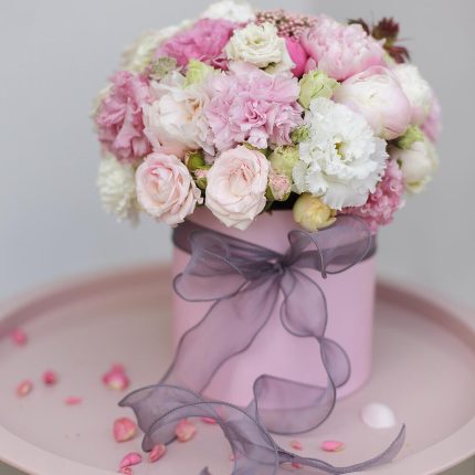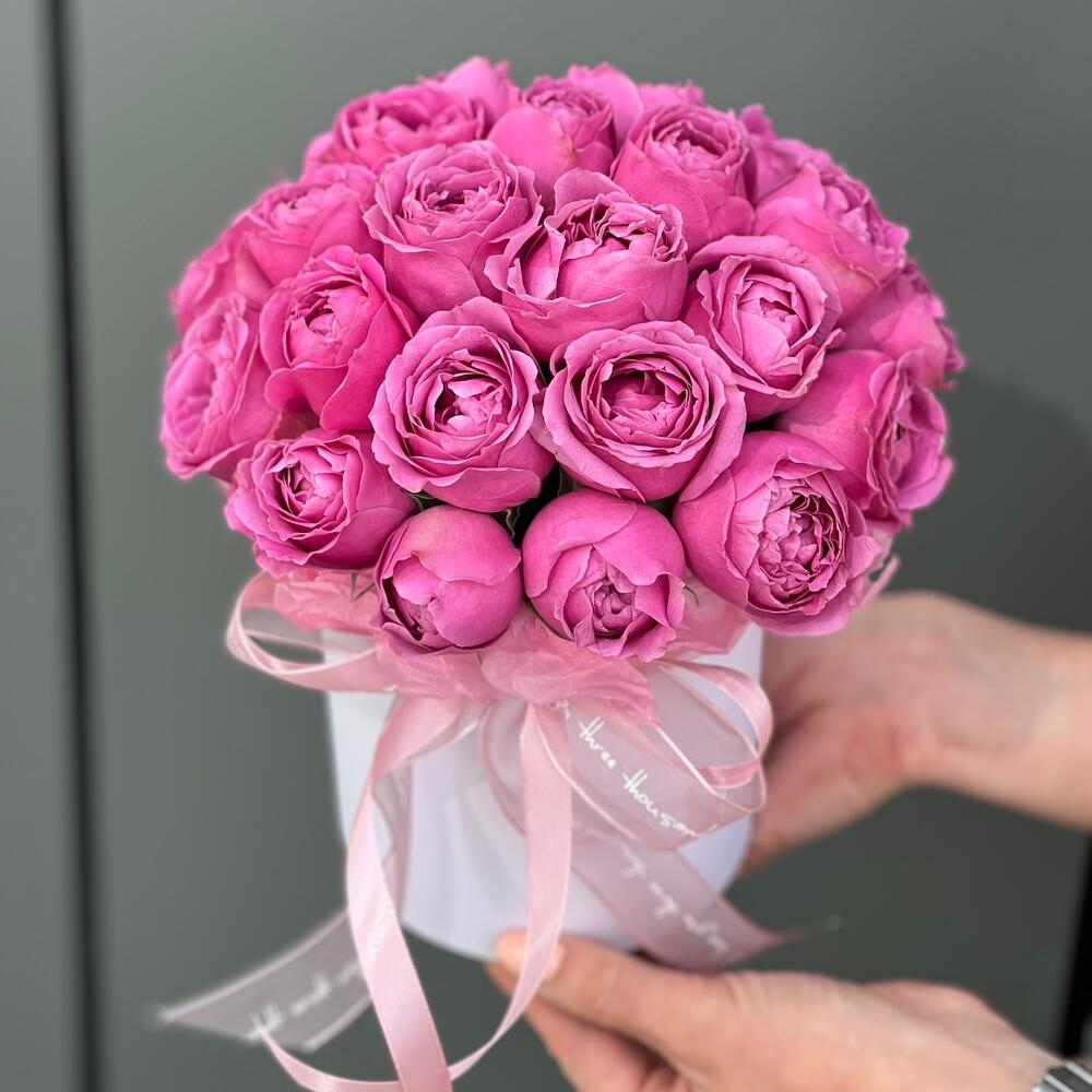 Кустовая пионовидная роза – 9 шт. Коробка – 1 шт. Оазис – 1 шт. Оформление – 1 шт.