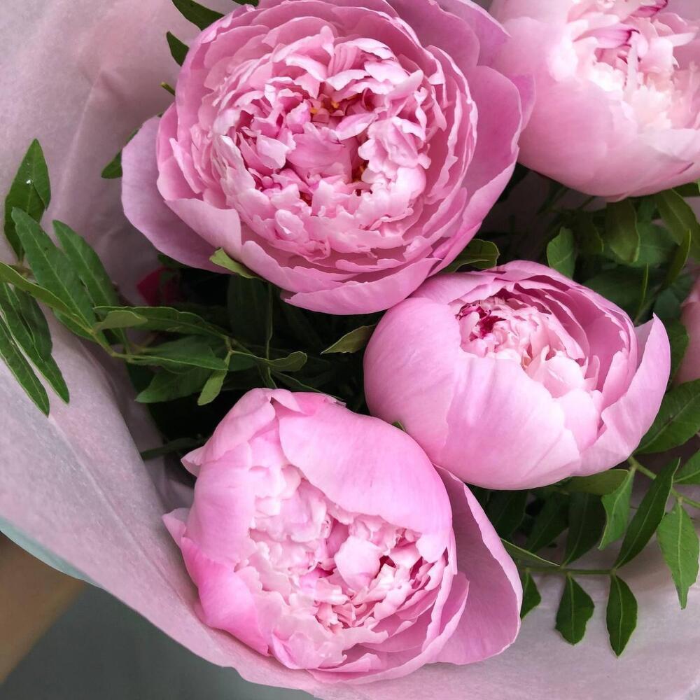 5 пионов розового цвета в яркой весенней упаковке