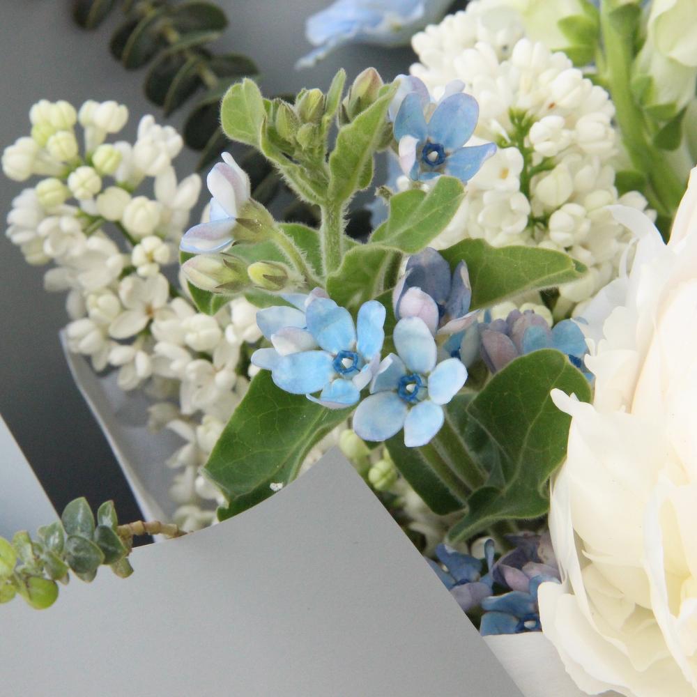 Дельфиниум – 2 шт.Пион – 1 шт.Твидия – 1 шт.Львиный зев – 2 шт.Маттиола – 2 шт.Эвкалипт – 2 шт.Тишью – 1 шт.Упаковка дизайнерская – 3 шт.Лента – 1 шт.