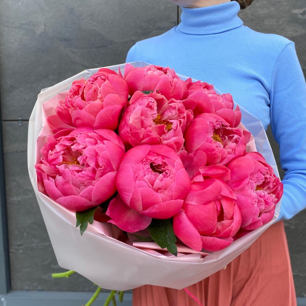 Лента атласная – 1 шт.Упаковка дизайнерская – 2 шт.Пион коралл шарм – 9 шт.