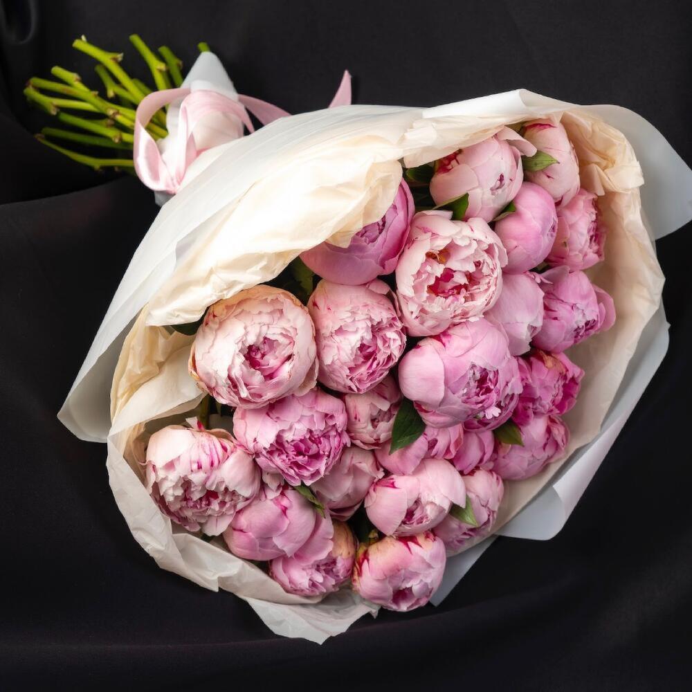 Пион розовый – 25 шт.Упаковка дизайнерская – 2 шт.Лента атласная – 2 шт.Открыточка с вашими пожеланиями – 1 шт.хорошее настроение – 100 шт.инструкция по уходу за цветами – 1 шт.коробка переноска – 1 шт.Кризал – 1 шт.
