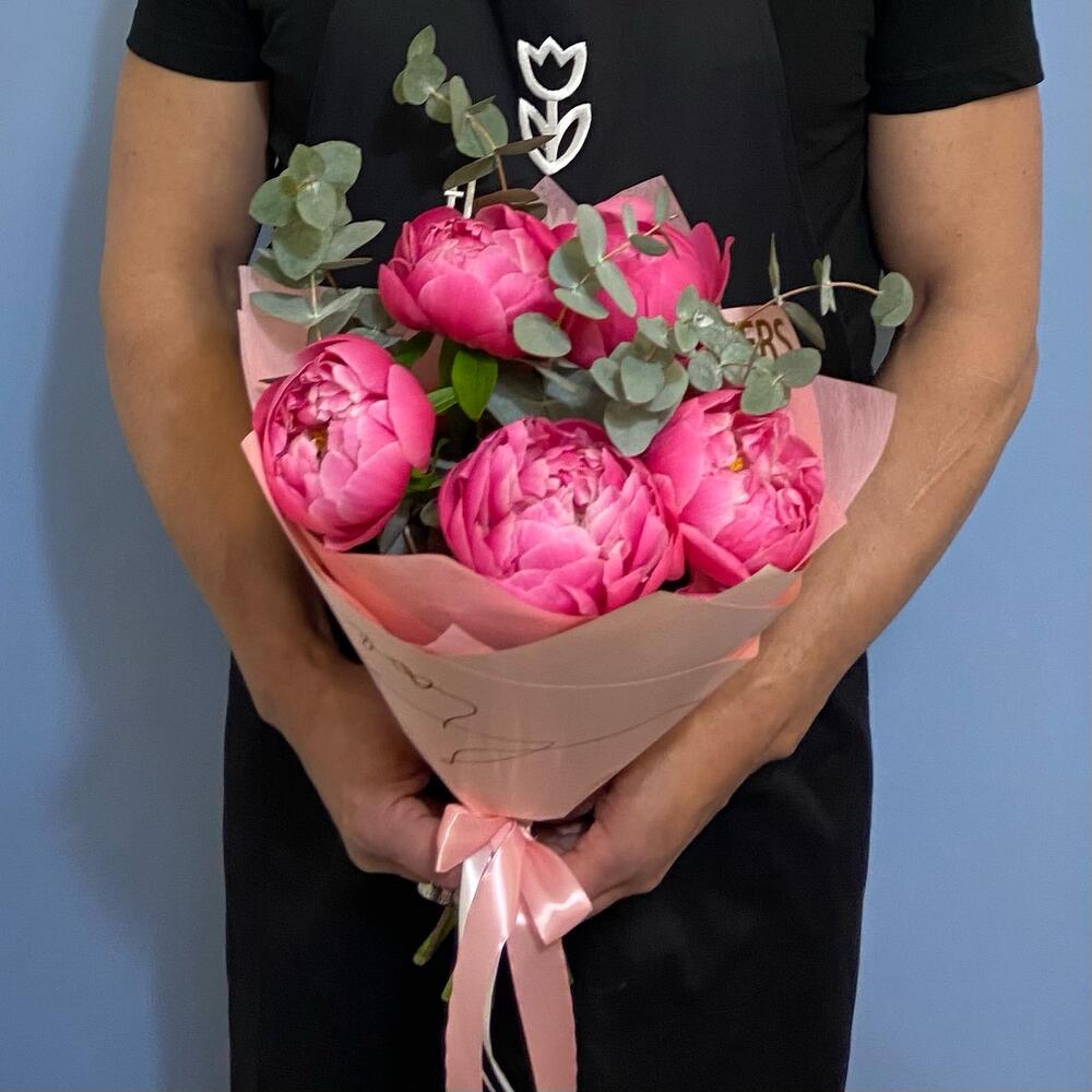 Пион – 5 шт.Эвкалипт – 3 шт.Упаковка – 1 шт.Лента атласная – 1 шт.