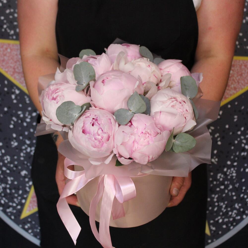 Эвкалипт – 2 шт.Лента атласная – 1 шт.Шляпная коробка – 1 шт.Пион Сара Бернар – 11 шт.Пленка матовая – 1 шт.Оазис флористический – 1 шт.