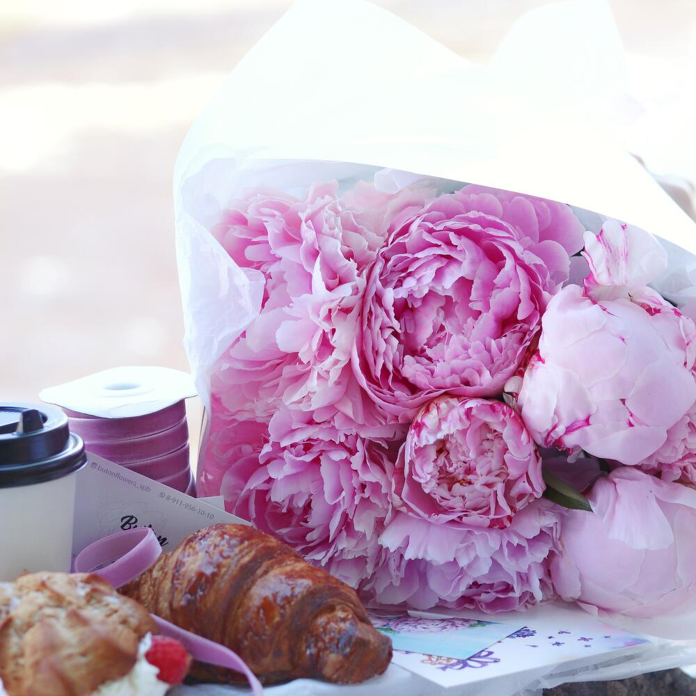 Пион розовый – 9 шт.Подкормка – 1 шт.Открыточка с вашими пожеланиями – 1 шт.Шоколадка – 1 шт.Дизайнерская упаковка – 1 шт.инструкция по уходу за цветами – 1 шт.