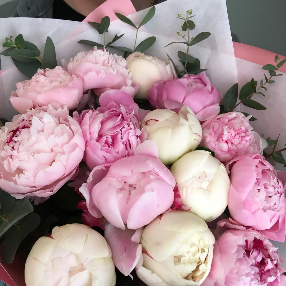 Роскошный букет из нежно розовых и сливочных пионов, 15 штук с веточками ароматного эвкалипта, в дизайнерской упаковке.Высота пионов шестьдесят сантиметров, ширина букета сорок сантиметров.Пышный и нежный букет пионов никого не оставит равнодушным.Стильное цветочное решение для любого случая.Отличный выбор для подарка на день всех влюблённых, 14 февраля.