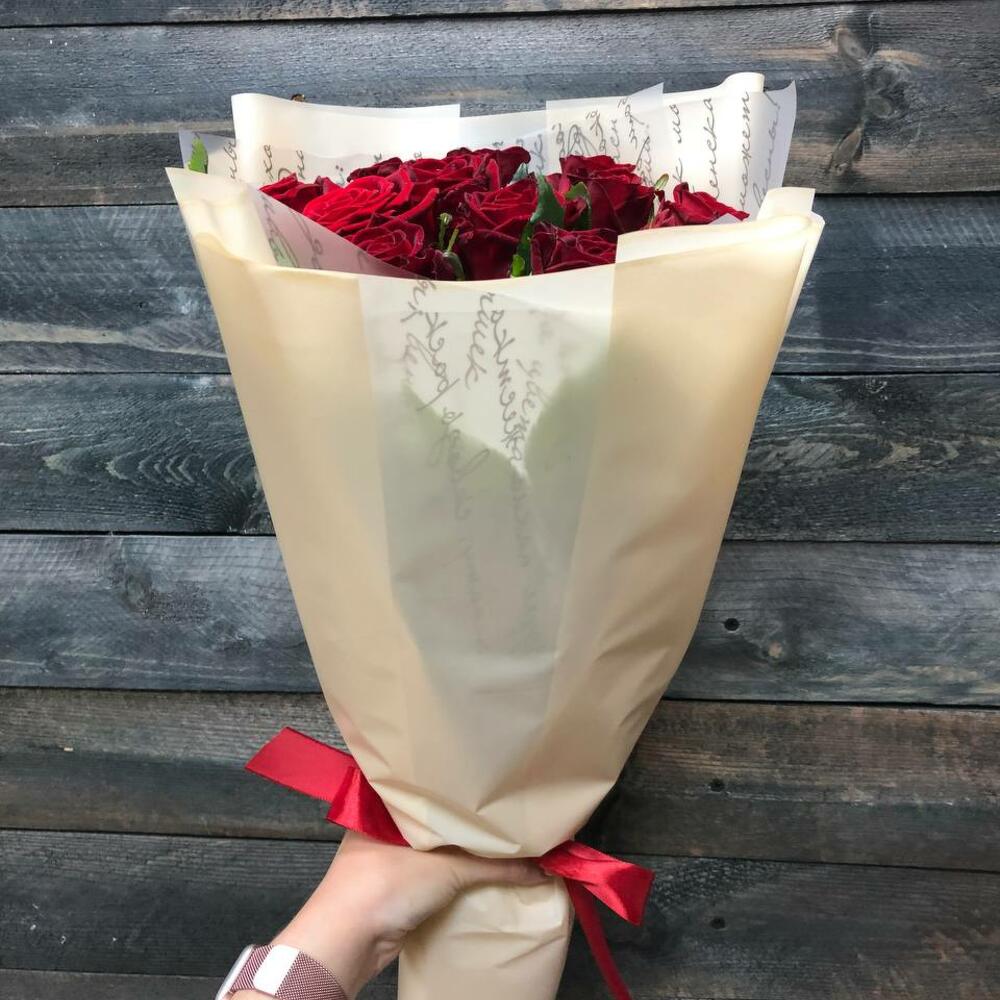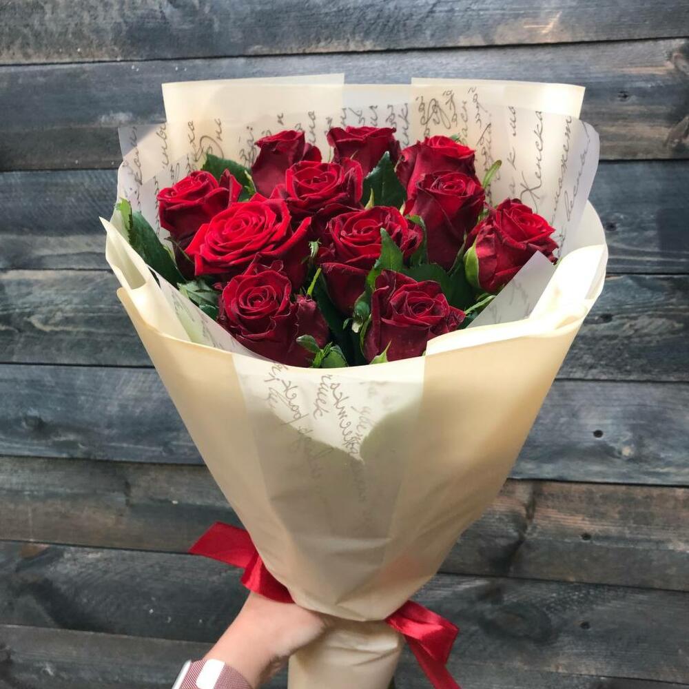 Лента – 1 шт.Упаковка – 1 шт.Роза красная 60 см – 11 шт.