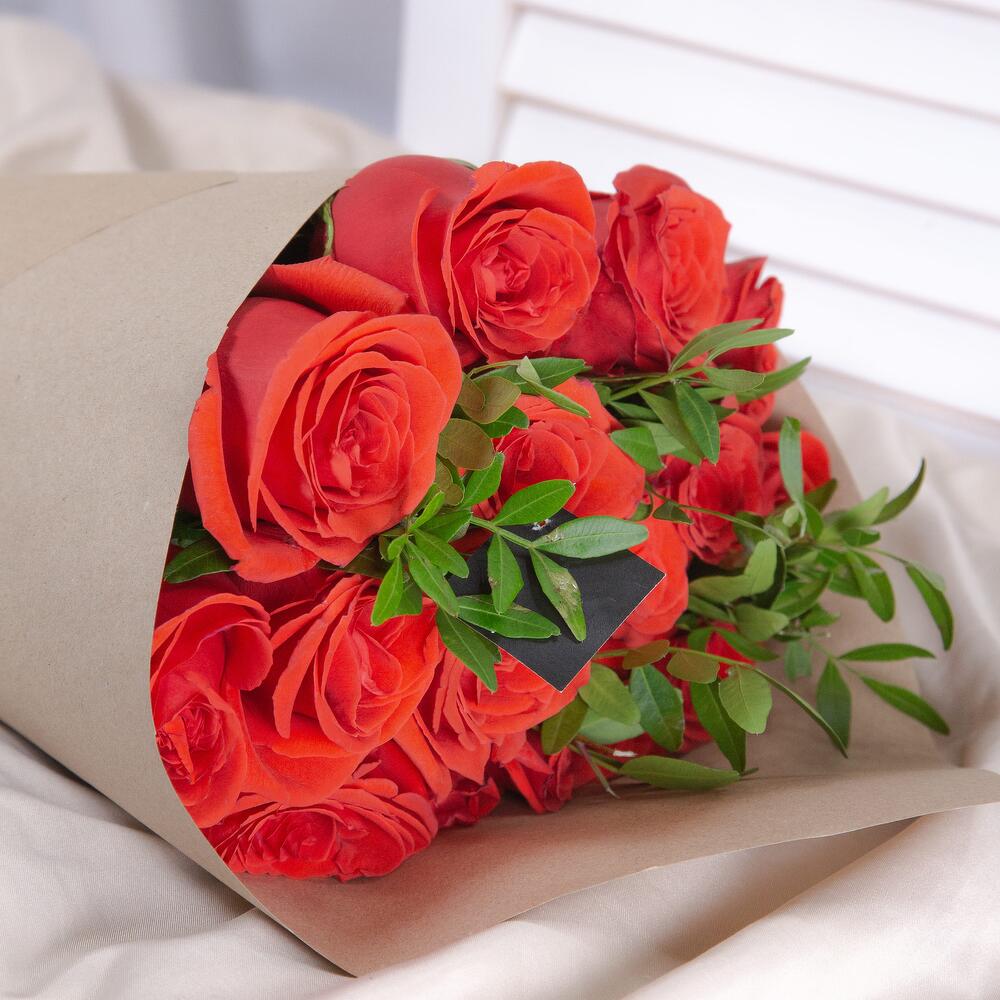 15 роз с зеленью в крафт-упаковке