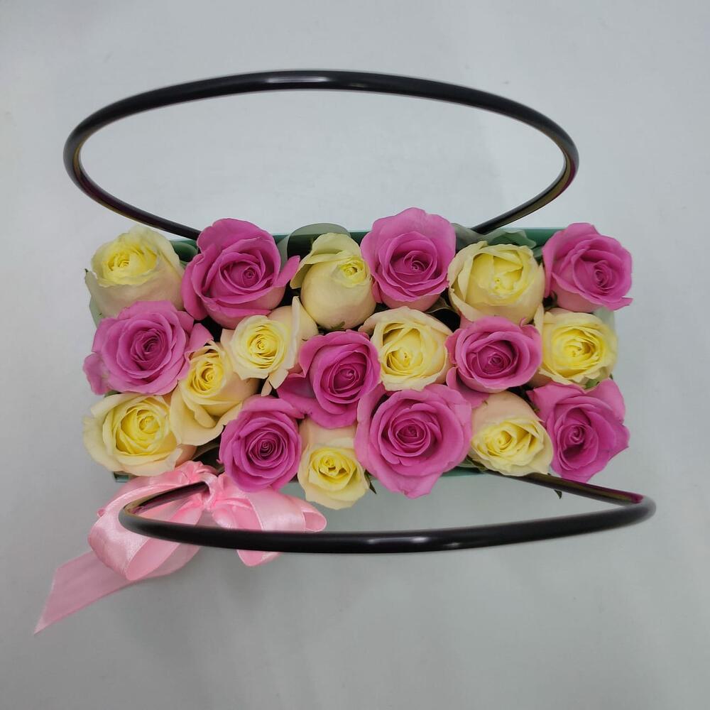 роза кения микс – 19 шт.Флористический оазис – 1 шт.Сумочка – 1 шт.
