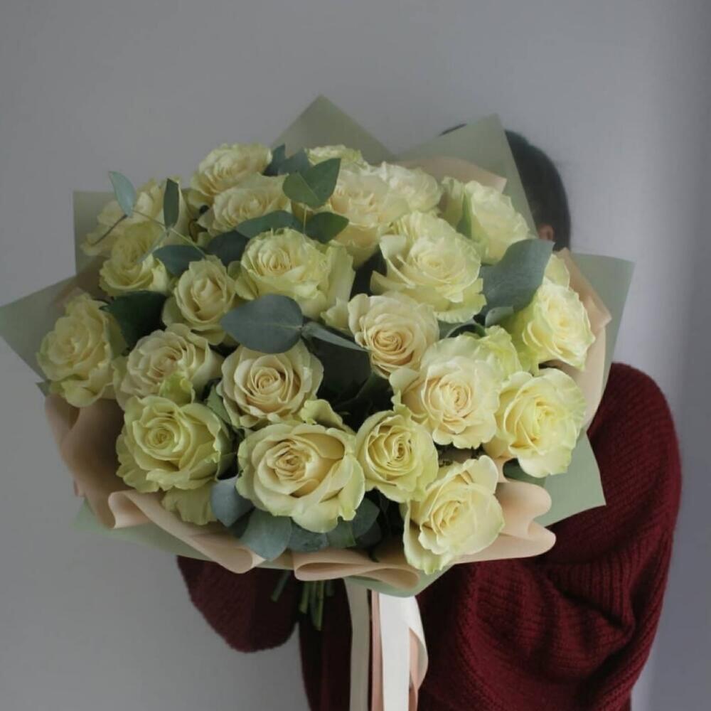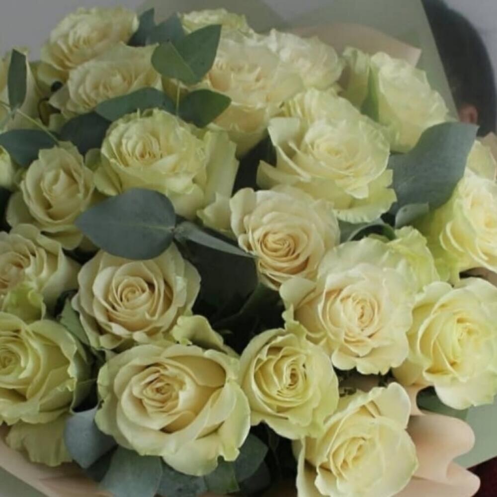 Эвкалипт – 5 шт.Дизайнерская упаковка – 2 шт.mondial роза одноголовая 60 см – 25 шт.