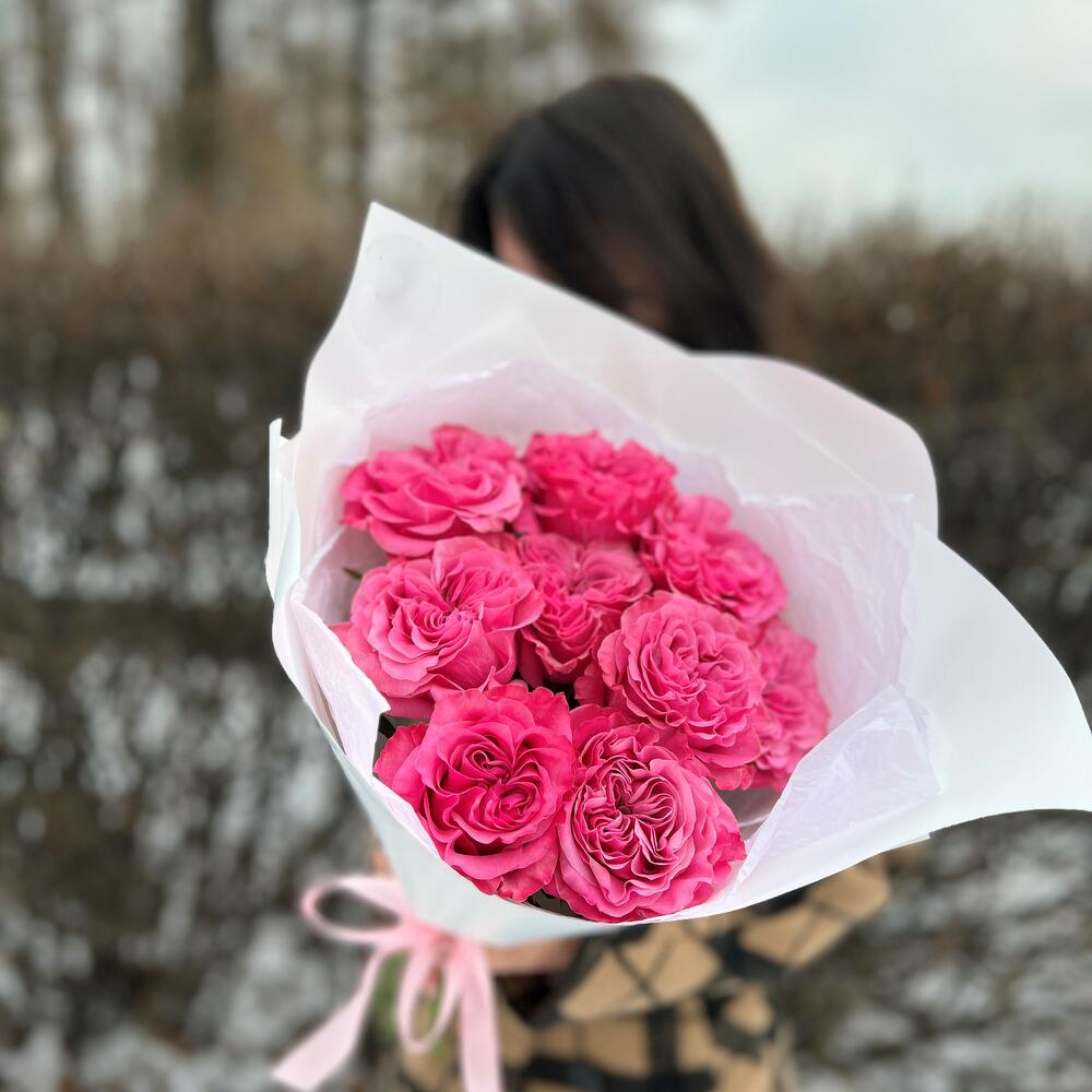 9 пионовидных роз сильва Пинк с эвкалиптом