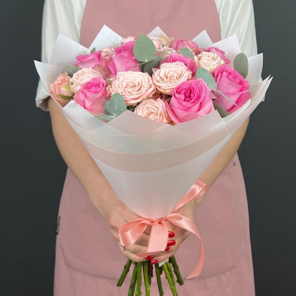 Авторский букет из розовых Пионовидных Роз и Эвкалипта