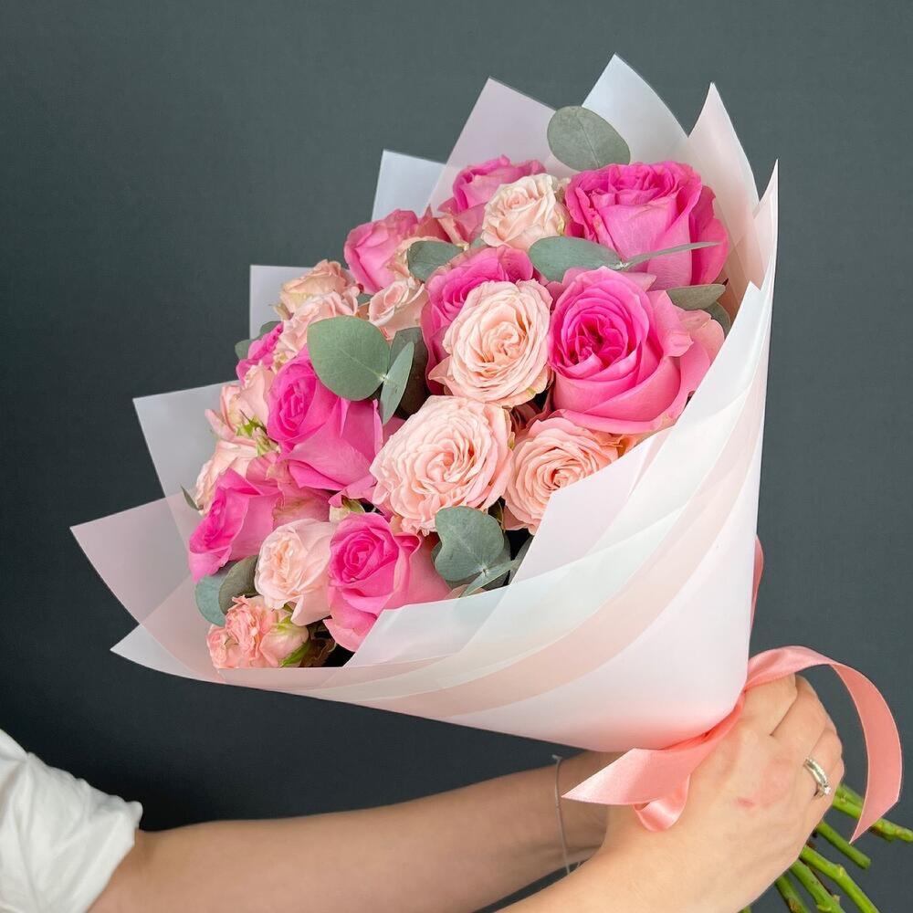 Роза кустовая пионовидная – 7 шт.Роза одноголовая – 9 шт.Эвкалипт – 5 шт.бумага дизайнерская – 6 шт.Лента атласная – 1 шт.