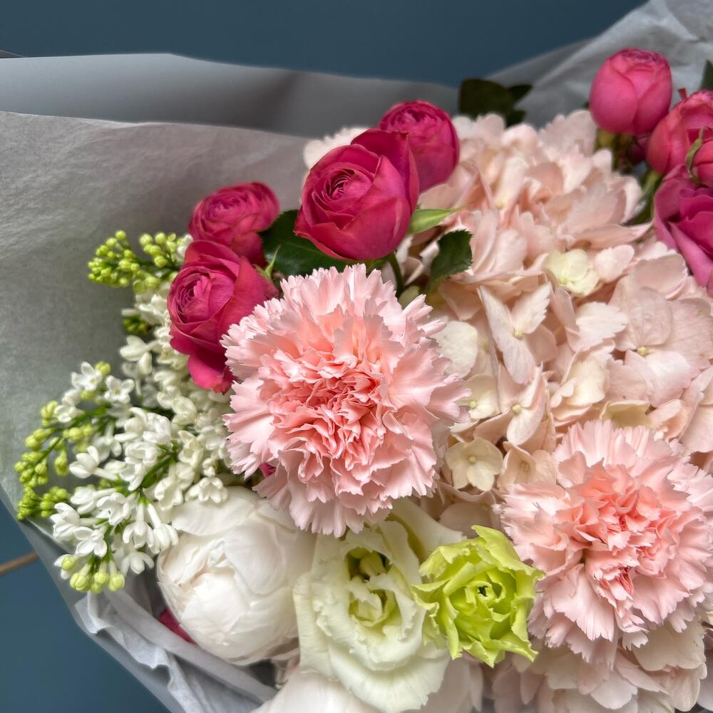 Эвкалипт – 1 шт.Сирень – 1 шт.Пион – 3 шт.роза кантри блю – 1 шт.Роза кустовая – 2 шт.Упаковка дизайнерская – 2 шт.Тишью – 3 шт.