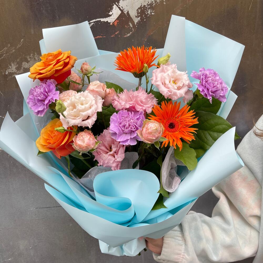 гербера мохровая – 2 шт.Диантус – 3 шт.Салал – 2 шт.Роза оранжевая – 2 шт.Роза пионовидная кустовая – 1 шт.Лизиантус – 1 шт.Упаковка дизайнерская – 3 шт.