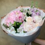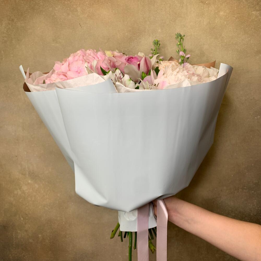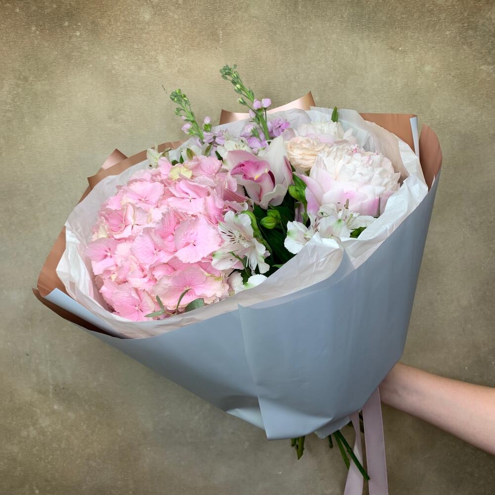 Гортензия – 1 шт.Маттиола – 2 шт.Пион – 2 шт.Роза кустовая – 1 шт.Альстромерия – 2 шт.Орхидея Цимбидиум – 1 шт.Эвкалипт – 1 шт.Упаковка – 2 шт.