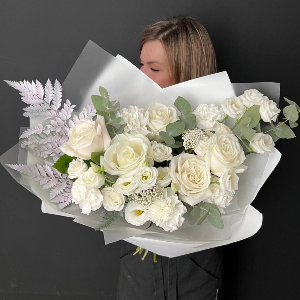 Белый букет с розами, ароматными маттиолами и эустомой