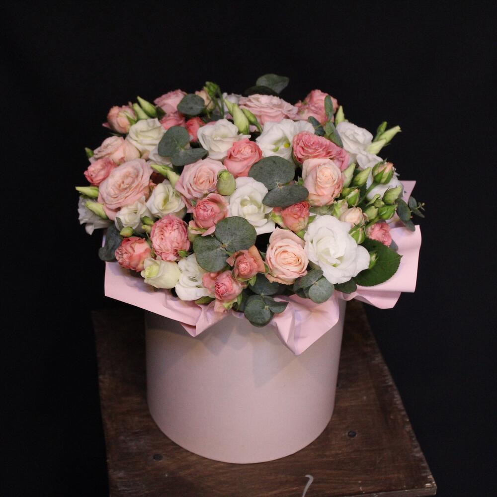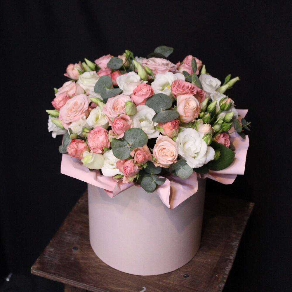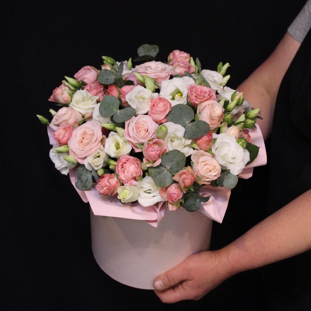 Эвкалипт – 2 шт.Шляпная коробка – 1 шт.Оазис флористический – 1 шт.эустома белая – 3 шт.Роза кустовая пионовидная мадам бомбастик – 6 шт.Пленка дизайнерская – 1 шт.