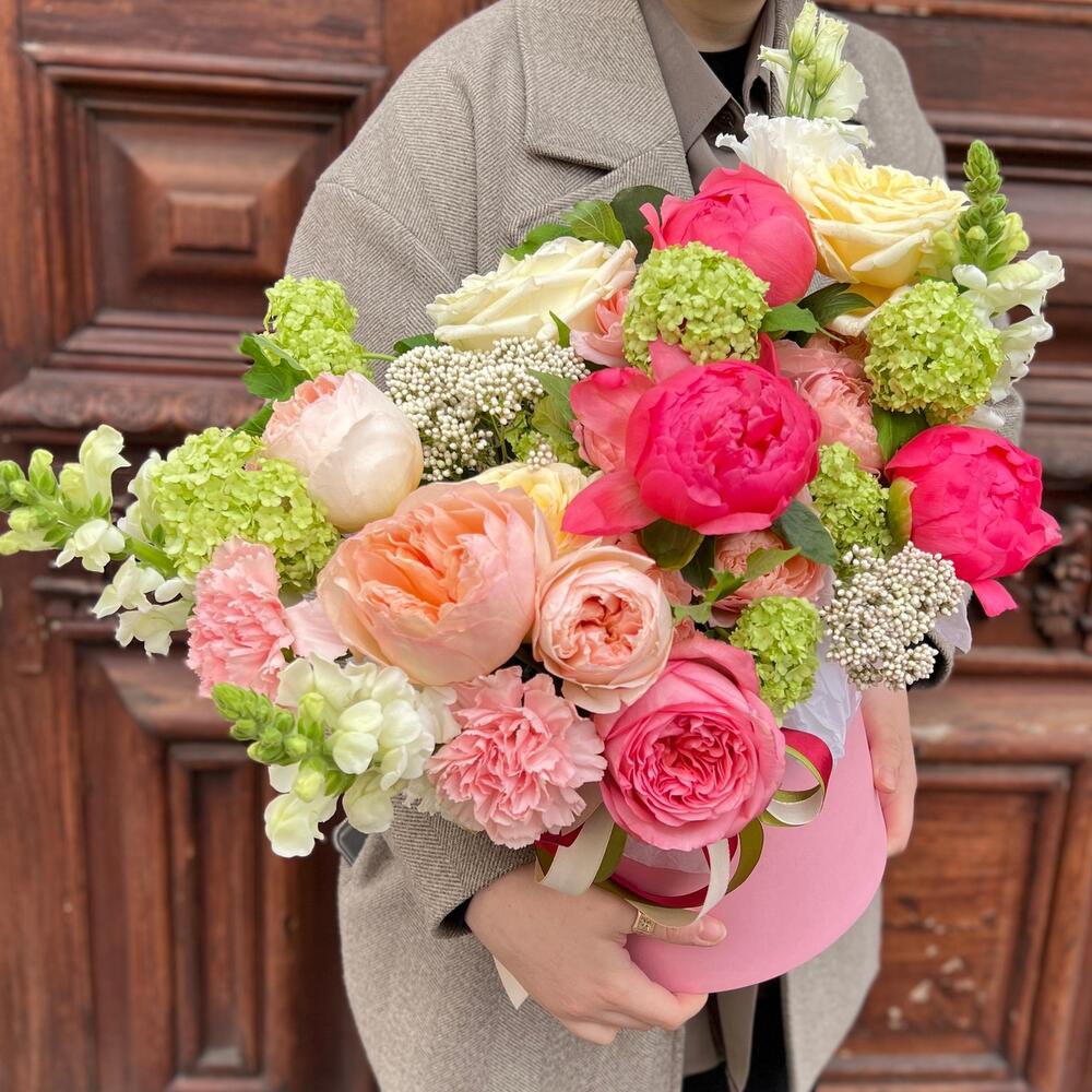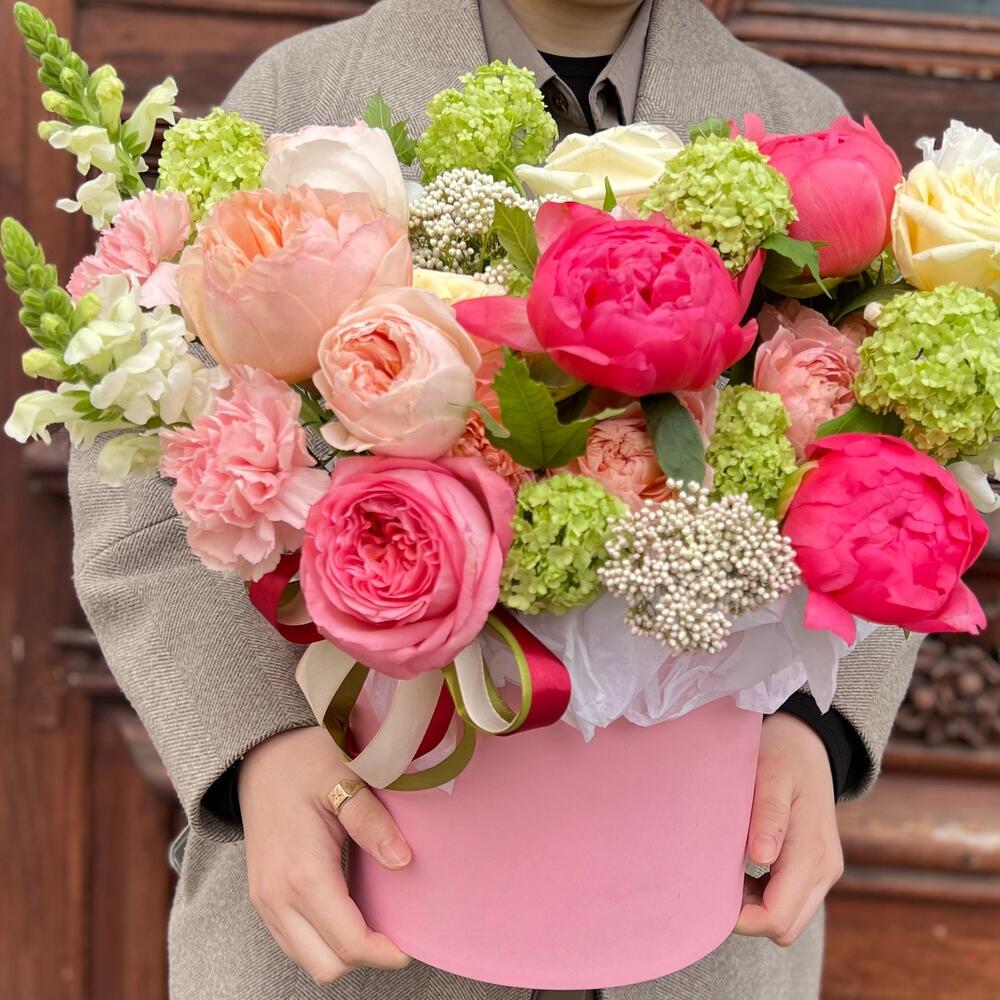 Вибурнум – 2 шт.Озотамнус – 2 шт.Лента атласная – 2 шт.Тишью – 1 шт.Диантус – 3 шт.Коробка шляпная – 1 шт.Роза остина пионовидная – 2 шт.Оазис флористический – 1 шт.Эустома белая махровая – 1 шт.джульетта роза пионовидная – 1 шт.Пион коралл шарм – 3 шт.антиринум – 3 шт.роза кэндллайт – 3 шт.