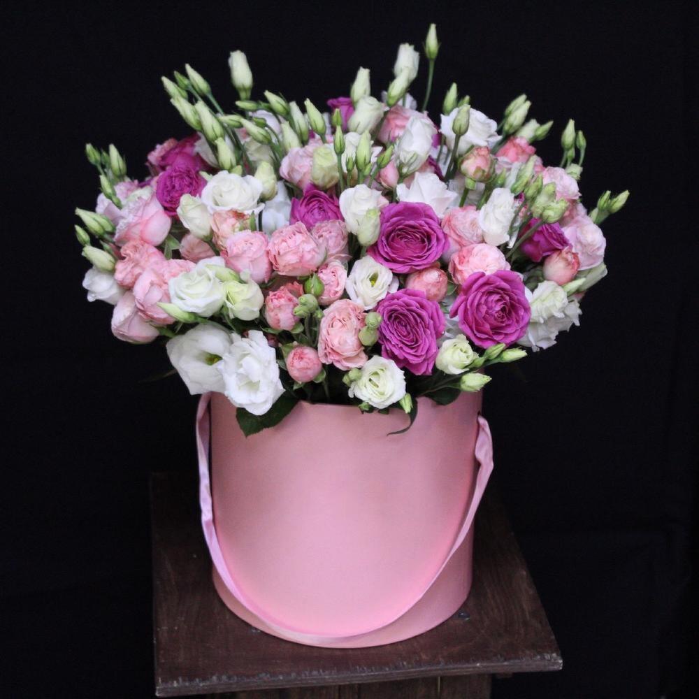 Роза кустовая пионовидная мадам бомбастик – 10 шт.роза кустовая пионовидная классик сенсейшн – 5 шт.Эустома – 10 шт.Оазис флористический – 1 шт.Шляпная коробка – 1 шт.