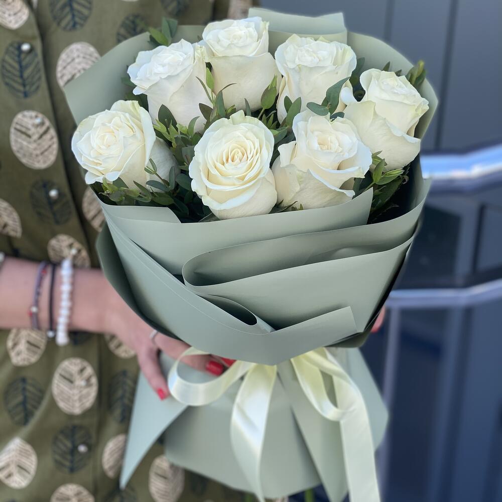 Эвкалипт – 2 шт. Роза белая – 7 шт. Оформление – 1 шт.