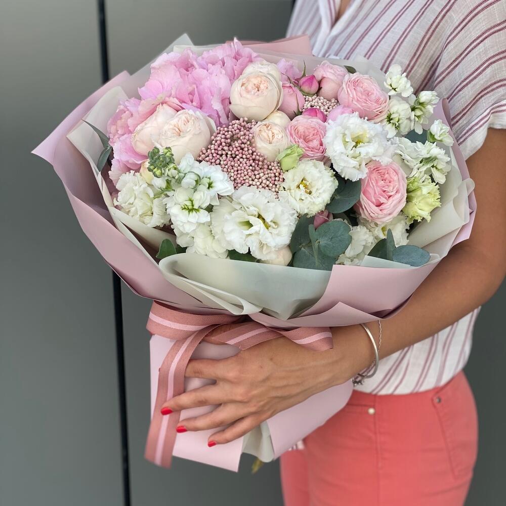 Букет Филинг из гортензии, пионовидной розы, озотамнуса и маттиолы