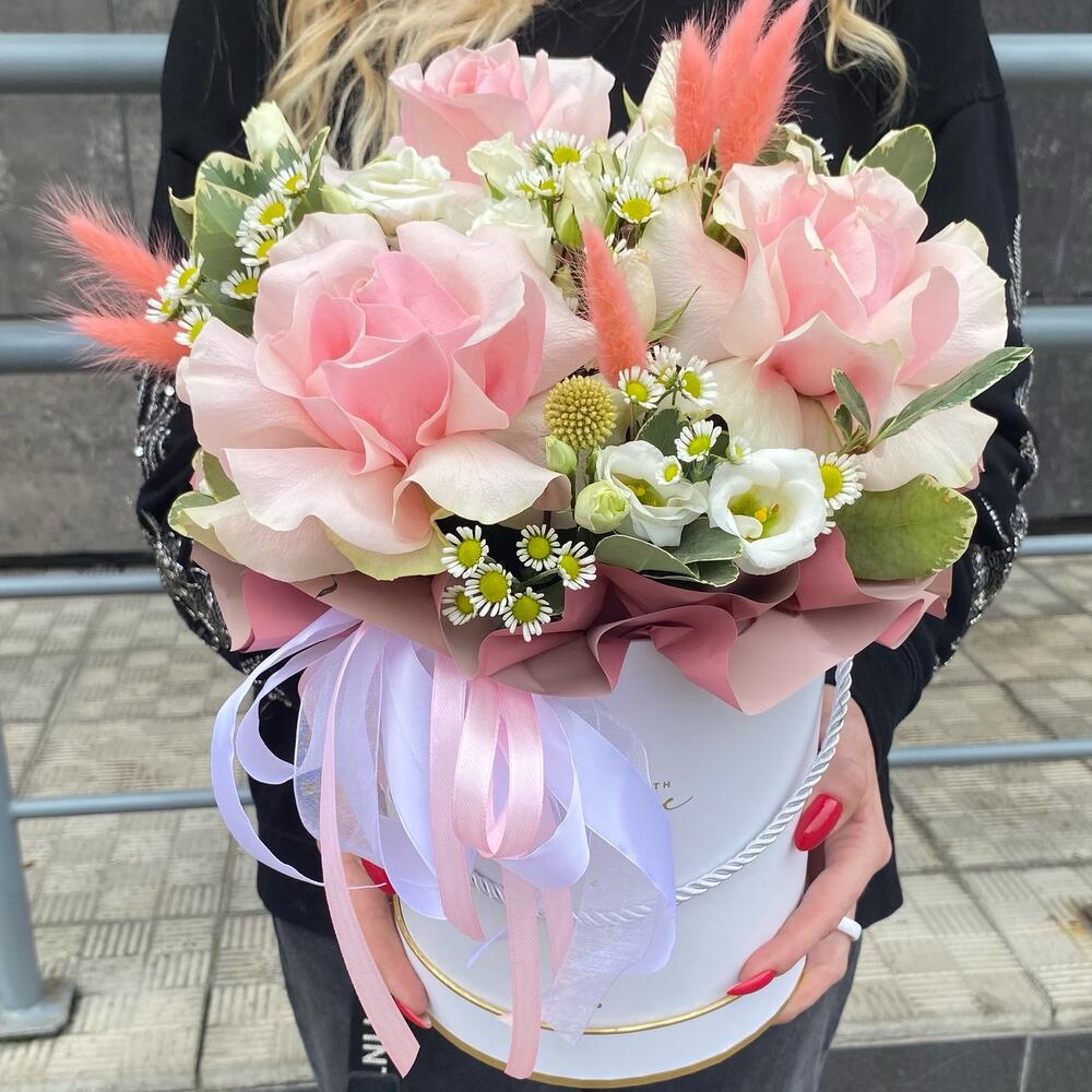 Краспедия – 3 шт. Эвкалипт – 1 шт. Хризантема – 2 шт. Эустома – 2 шт. Сухоцветы – 1 шт. Шляпная коробка с лентами – 1 шт. Французская роза – 3 шт.