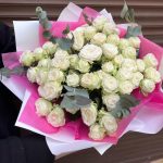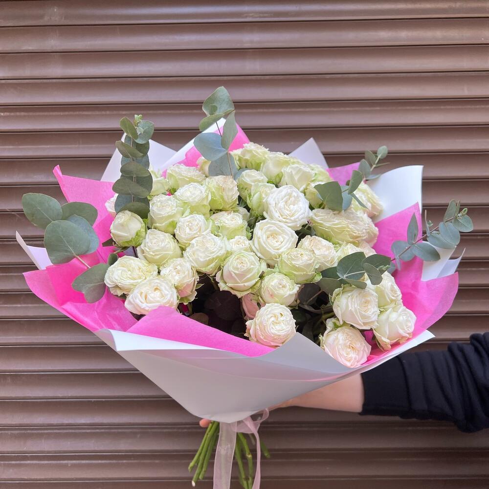 Эвкалипт – 7 шт.Лента атласная – 2 шт.Тишью – 2 шт.Пленка матовая – 2 шт.Роза кустовая пионовидная бомбастик – 15 шт.