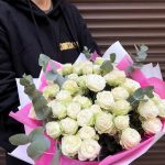 Букет из 15 белых пион роз кустовых с эвкалиптом (сб 015)