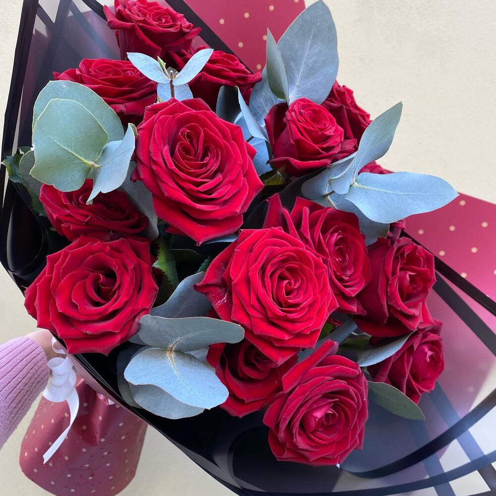 Букет из 15 роз с эвкалиптом