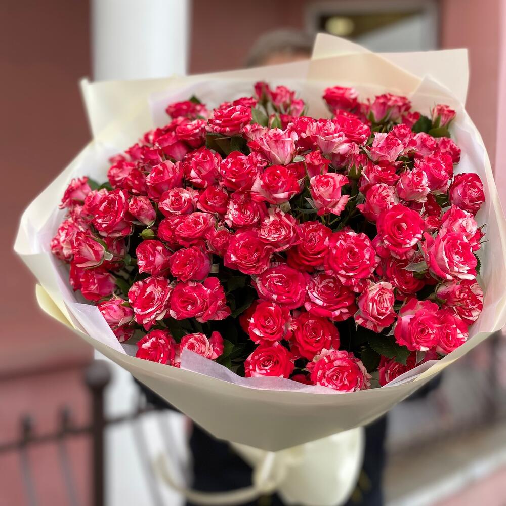 Букет из 19 веток кустовых роз сорта фаер воркса. Количество роз (бутонов) может достигать 131 штуки.