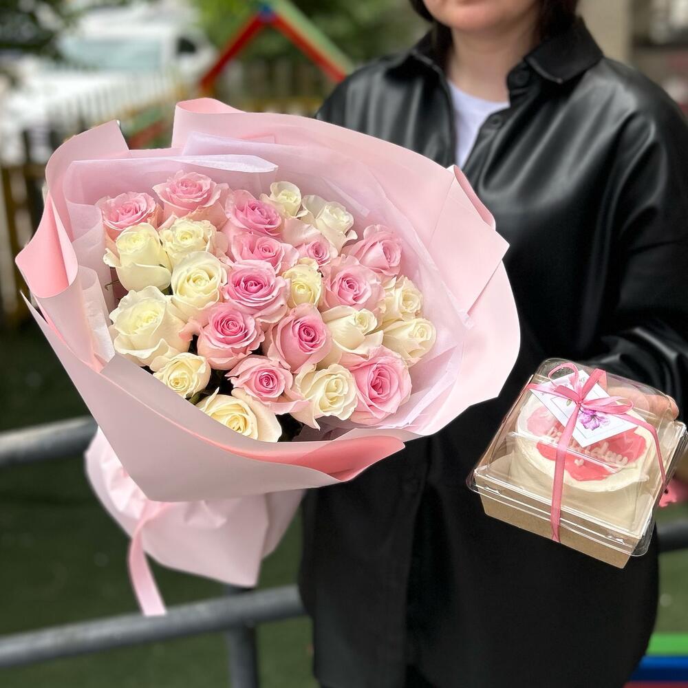 Букет из 25 роз и бенто торт