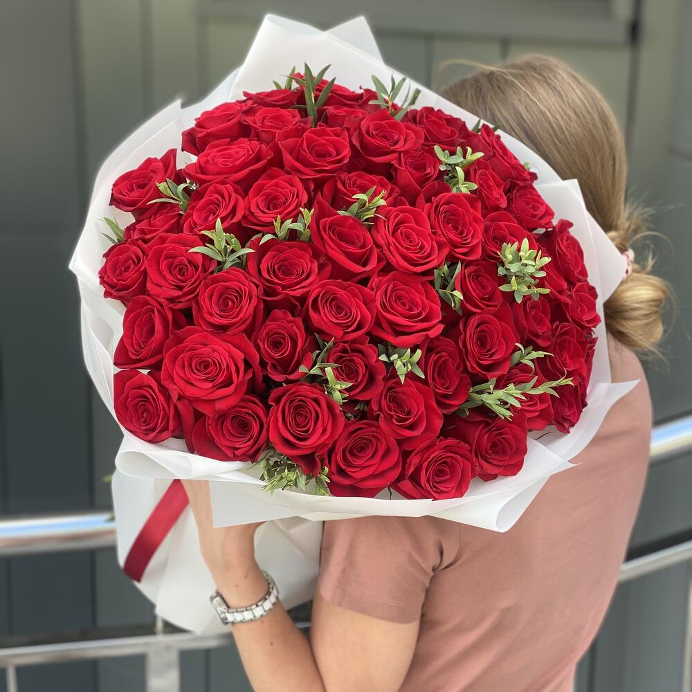 Эвкалипт – 3 шт. Оформление – 1 шт. роза красная фридом – 51 шт.