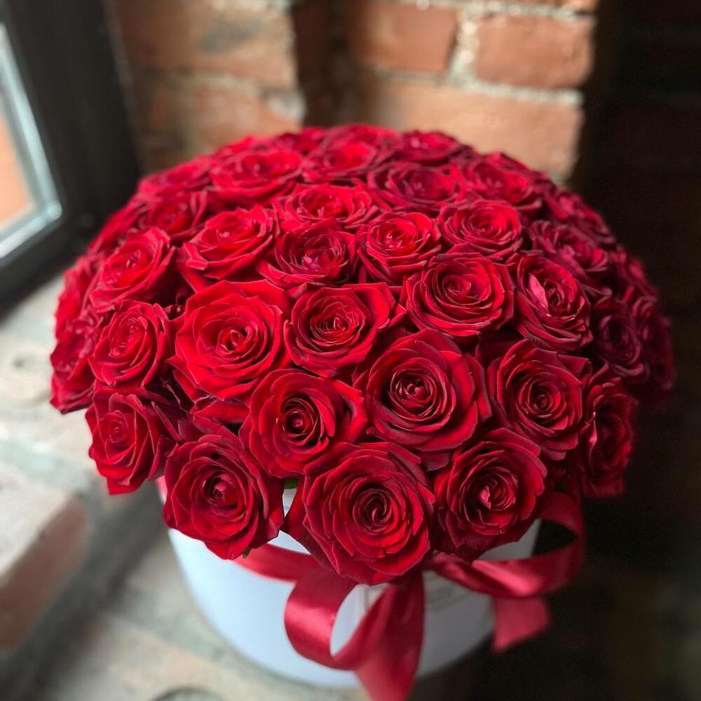 Букет из 51 красной розы в дизайнерской коробке “Роскошь красного”