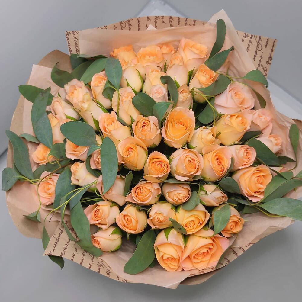 роза кения 40 см – 51 шт.Эвкалипт – 2 шт.Дизайнерская упаковка – 1 шт.