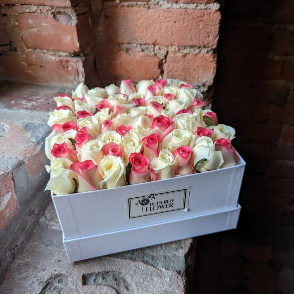 Букет из 65 розовых и белых роз в дизайнерской коробке "Ароматные шахматы"