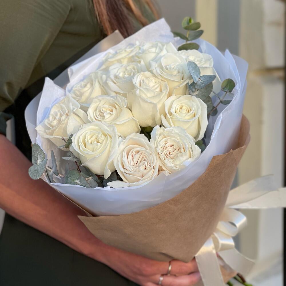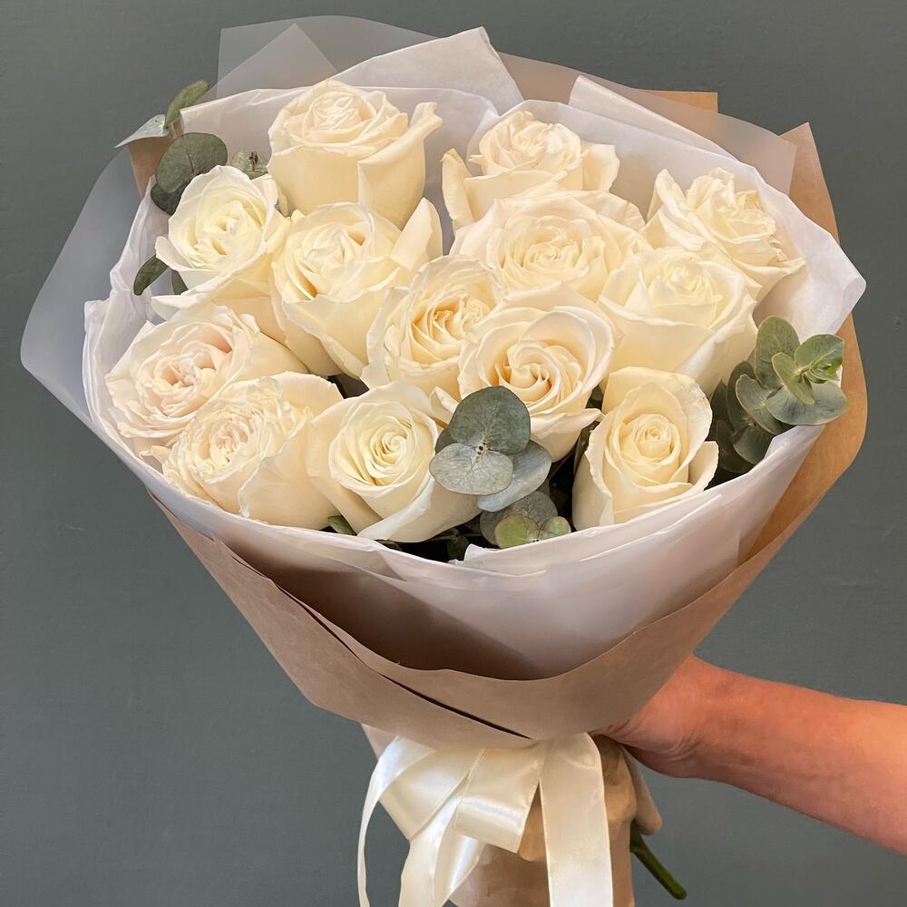 Эвкалипт – 1 шт.Роза одноголовая – 13 шт.Лента атласная – 1 шт.Тишью – 1 шт.Упаковка дизайнерская – 1 шт.