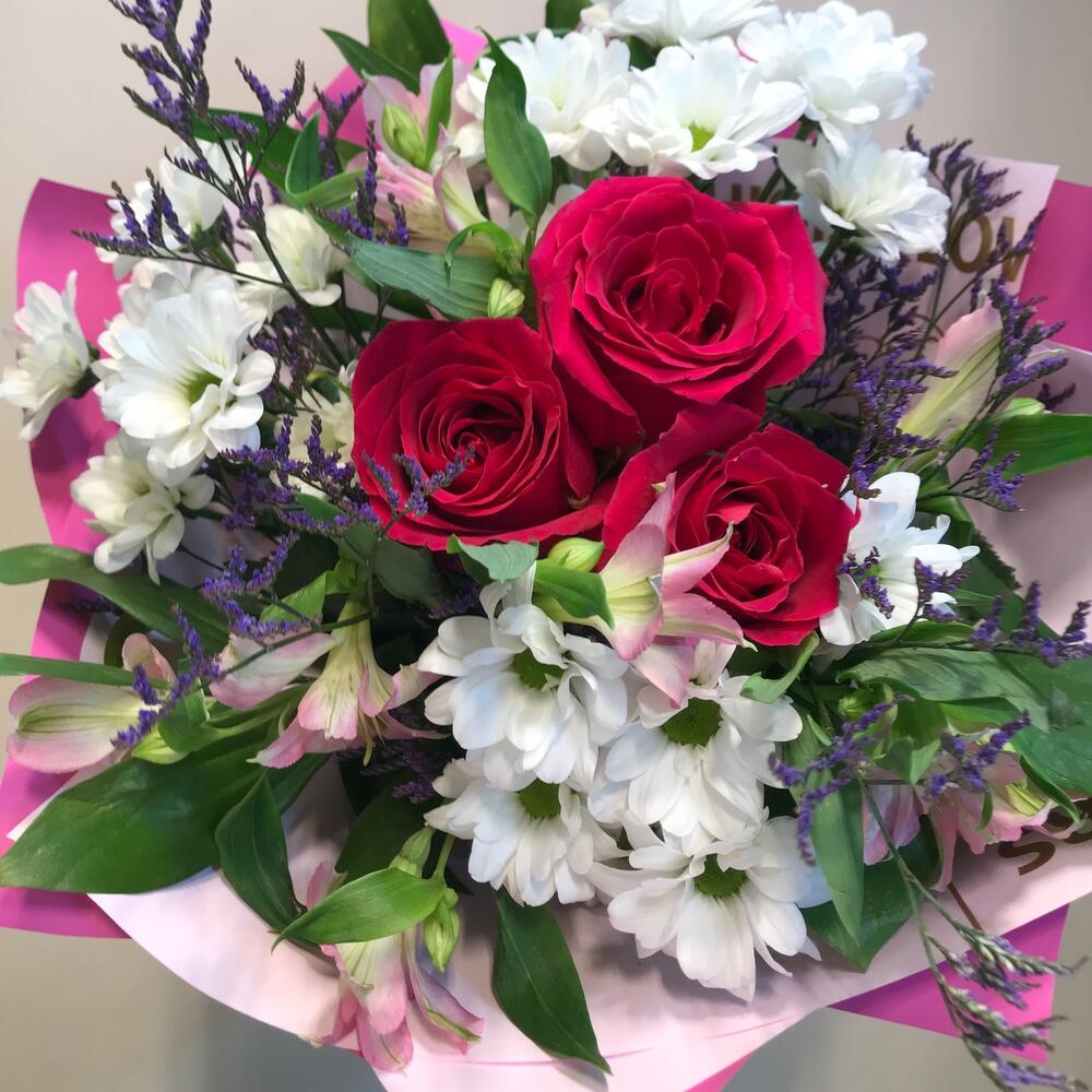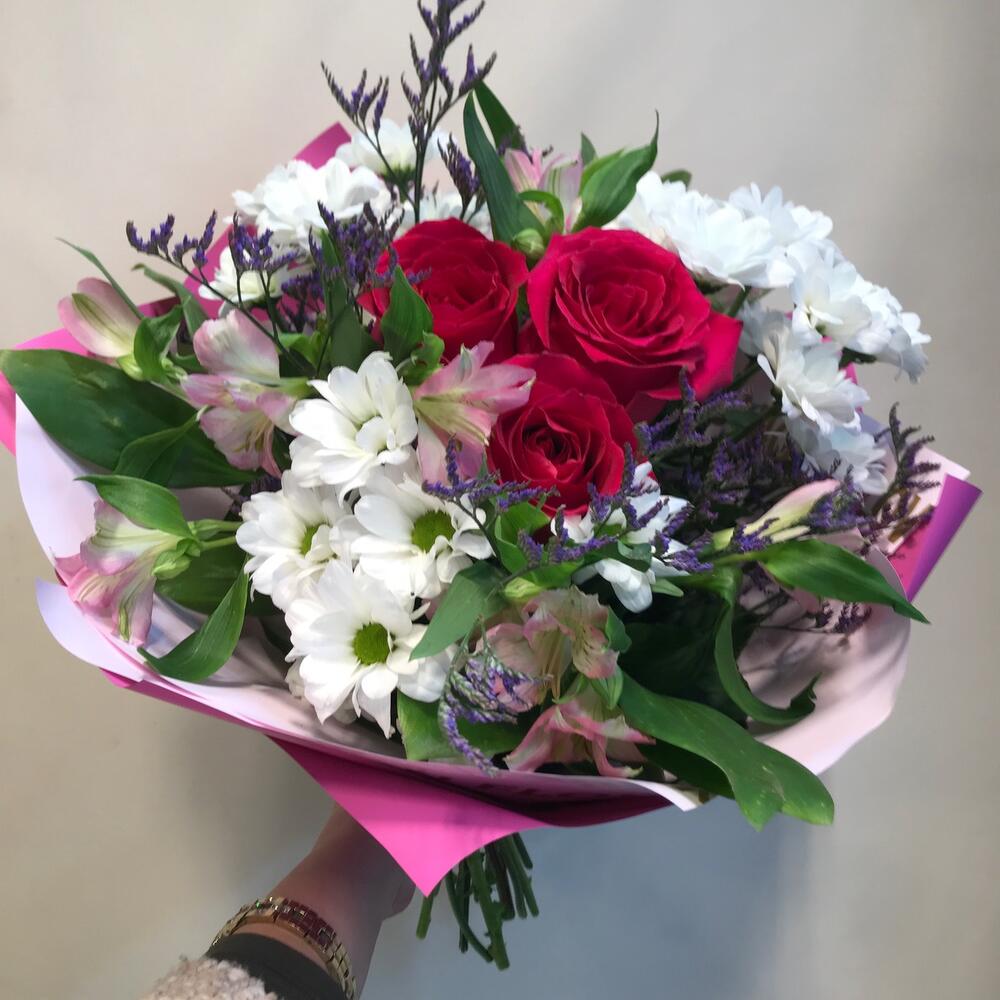 роза готча эквадор – 3 шт.Хризантема бакарди белая кустовая – 3 шт.Альстромерия – 3 шт.Лимониум сиреневый – 2 шт.Рускус сочи – 3 шт.Упаковка дизайнерская – 2 шт.