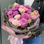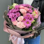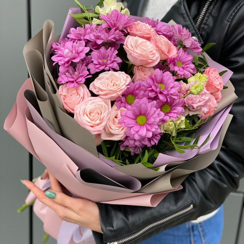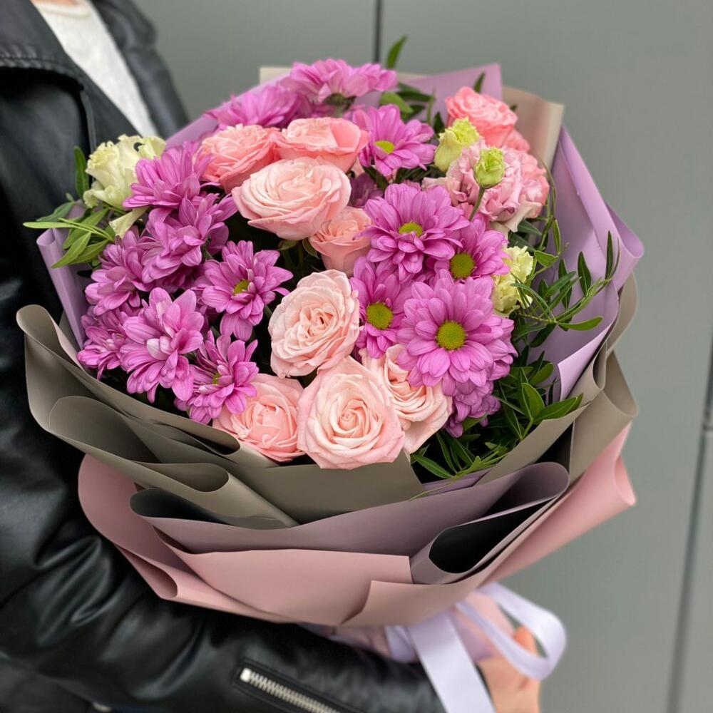 Хризантема – 3 шт. Эустома – 1 шт. Кустовая роза – 4 шт. Писташ – 2 шт. Оформление – 1 шт.