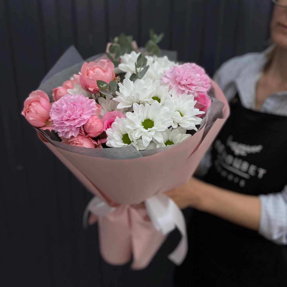 Нежный, легкий букет из стойких хризантем, диантуса и очаровательной пионовидной розы Джульетта
