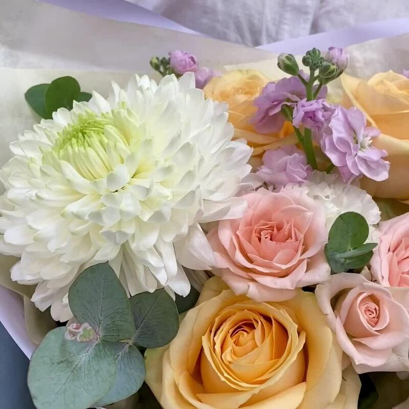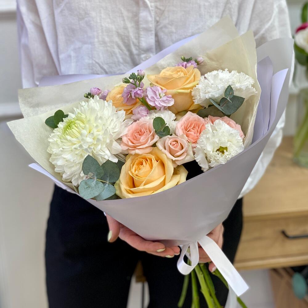 Роза кремовая – 3 шт.Кустовая роза – 1 шт.Упаковка дизайнерская – 1 шт.Хризантема белая – 1 шт.Эустома алиса – 1 шт.маттиола кустовая – 1 шт.эвкалипт 50 – 4 шт.