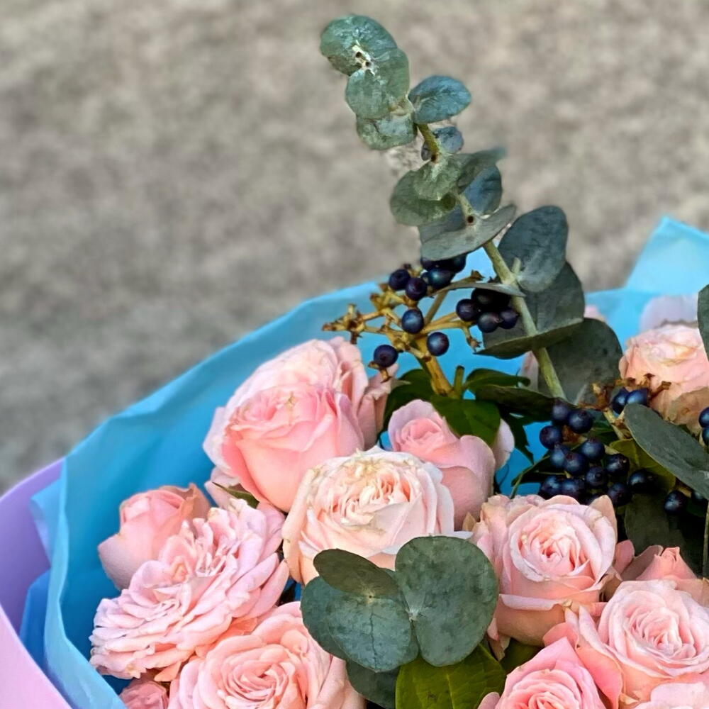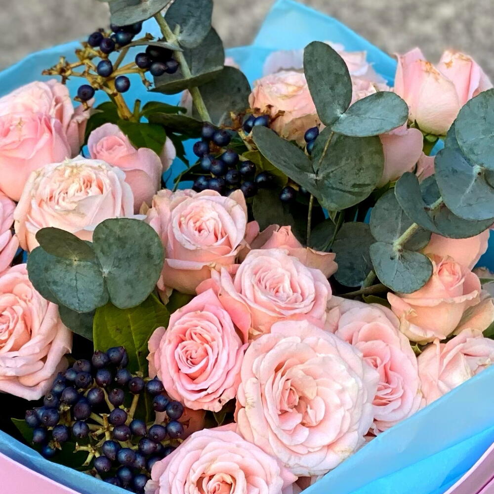 Роза кустовая Бомбастик – 9 шт. Вибурнум ягодный – 2 шт. Эвкалипт цинерея – 3 шт. Дизайнерская упаковка – 1 шт.