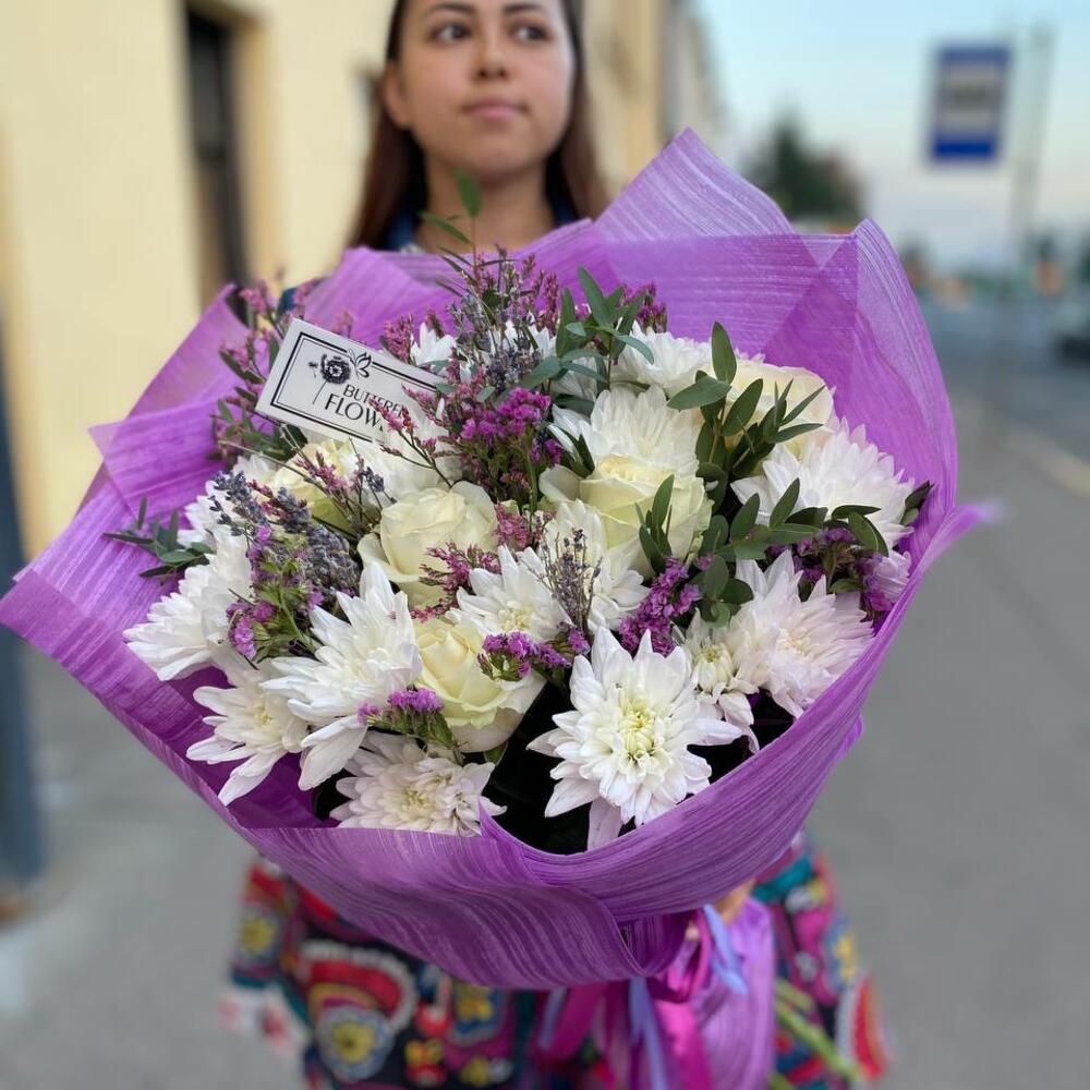 Букет из лаванды, кустовых хризантем, роз, лимониума, статицы и эвкалипта в стильной упаковке “Сендлер”
