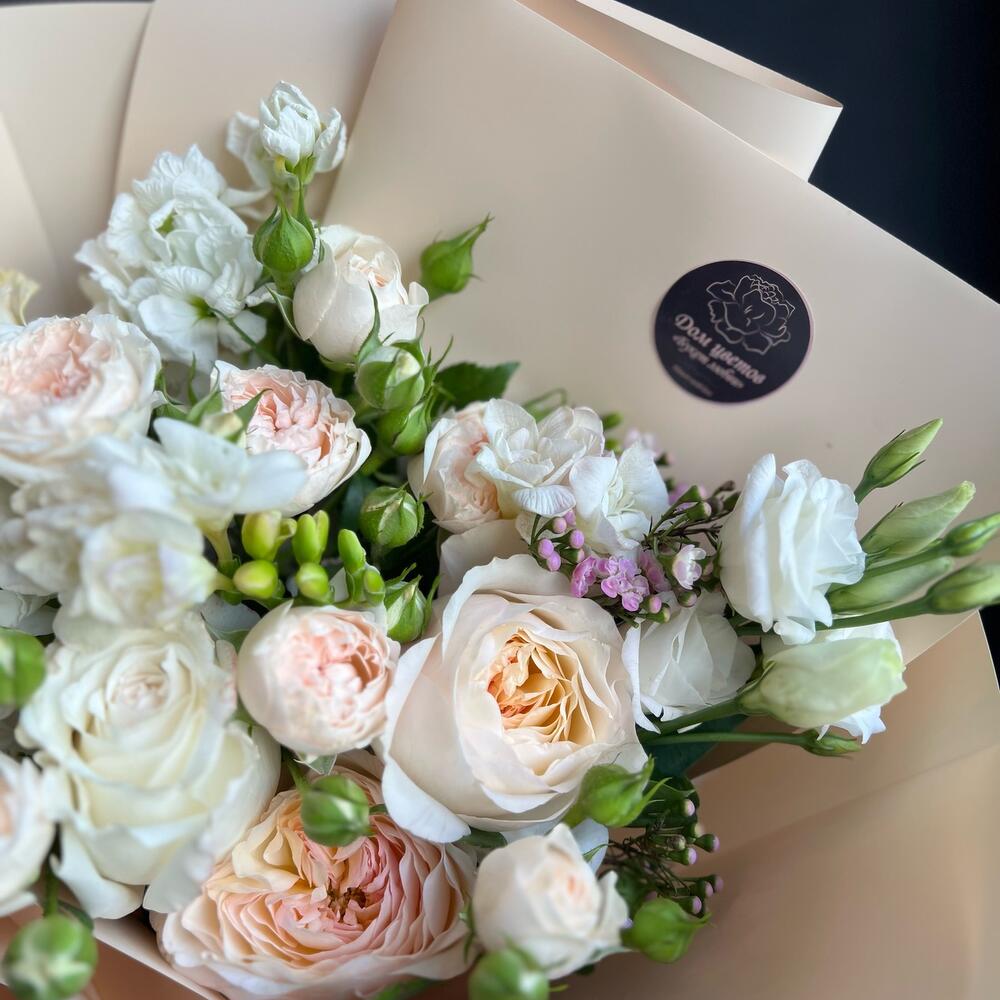 Пионовидная роза – 3 шт.Кустовая пионовидная роза – 2 шт.Маттиола – 2 шт.Фрезия белая – 2 шт.Хамелациум – 1 шт.лизтантус – 1 шт.декоративная упаковка – 1 шт.Атласная лента – 1 шт.