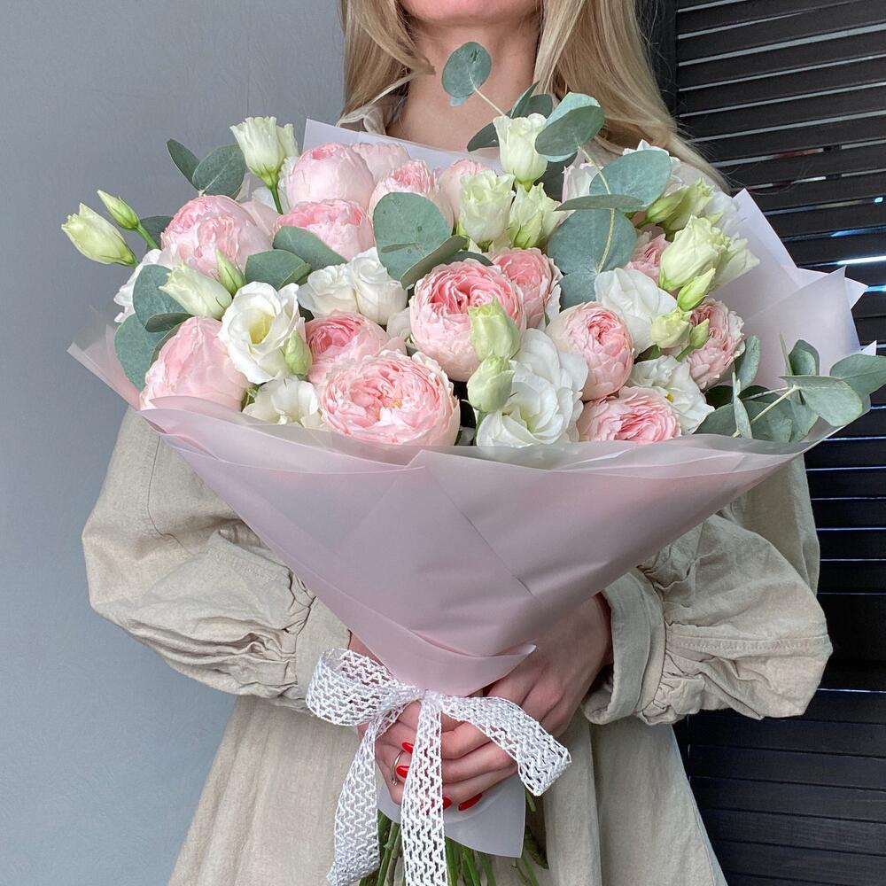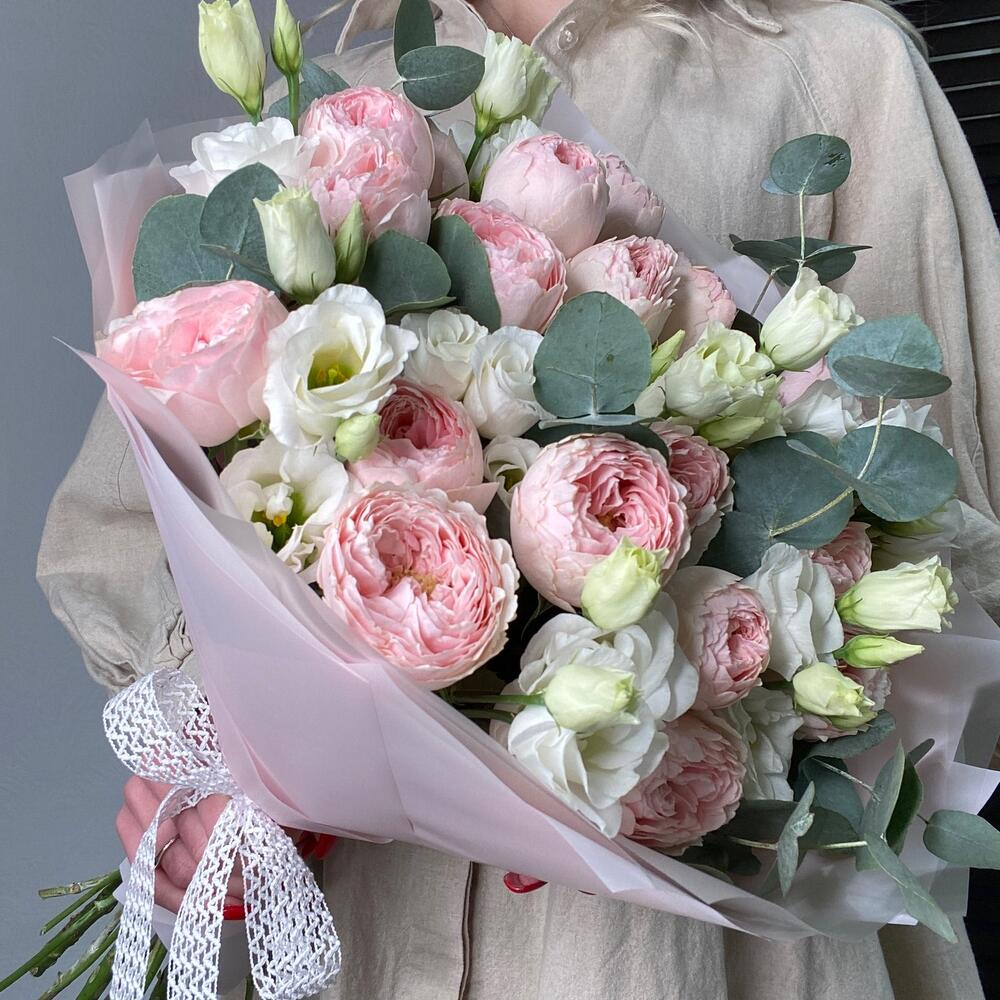 Букет из пионовидных роз мэнсфилд парк с эустомой и эвкалиптом