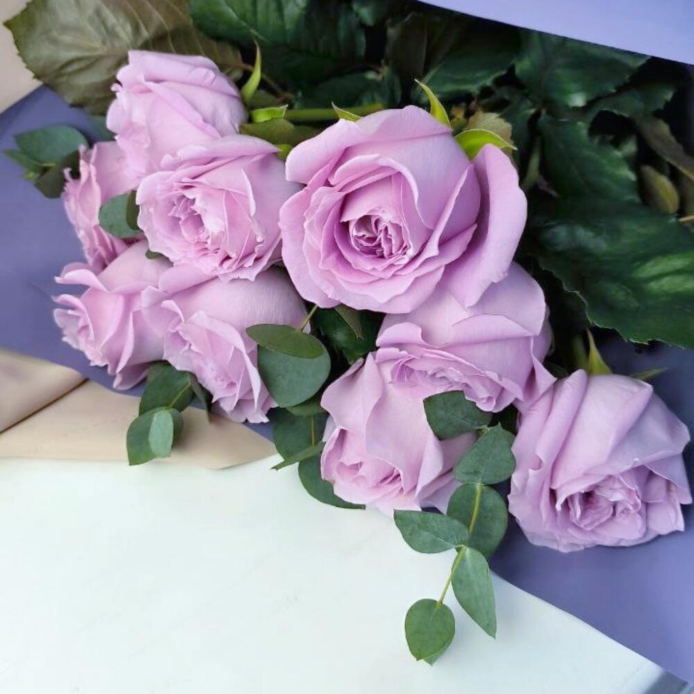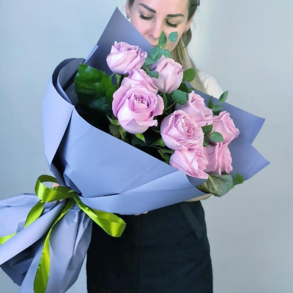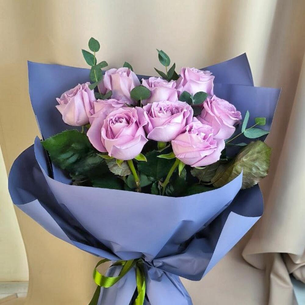 Эвкалипт – 3 шт.Лента атласная – 1 шт.Пленка – 1 шт.Роза маритим – 9 шт.