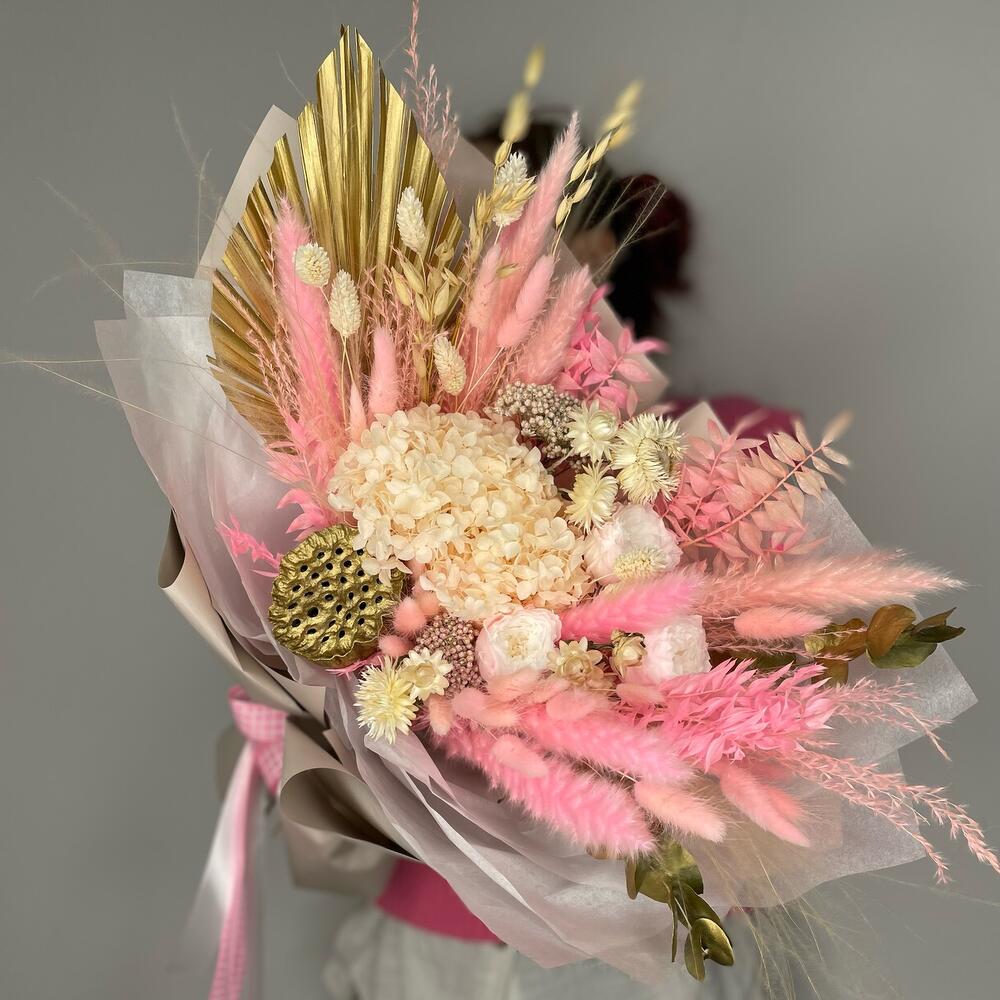 Лента – 1 шт.Тишью – 1 шт.Упаковка дизайнерская – 1 шт.Роза стабилизированная – 3 шт.Ковыль – 3 шт.Фаларис – 7 шт.Лагурус (сухоцвет) – 27 шт.Эвкалипт сухоцвет – 2 шт.камыш – 9 шт.овес сухоцвет – 5 шт.гортензия сухоцвет – 1 шт.мискантус – 3 шт.озотамнус сухоцвет – 2 шт.гелихризум (сухоцвет) – 3 шт.рускус сухоцвет – 3 шт.лист пальмы сухоцвет – 1 шт.лотос коробочка – 1 шт.