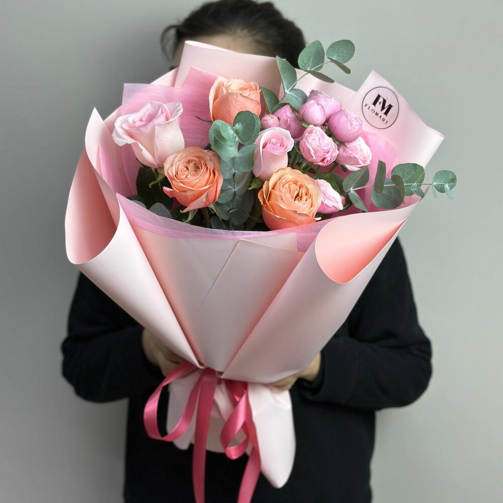 Букет из розовых гвоздик, пионовидных роз, эустом